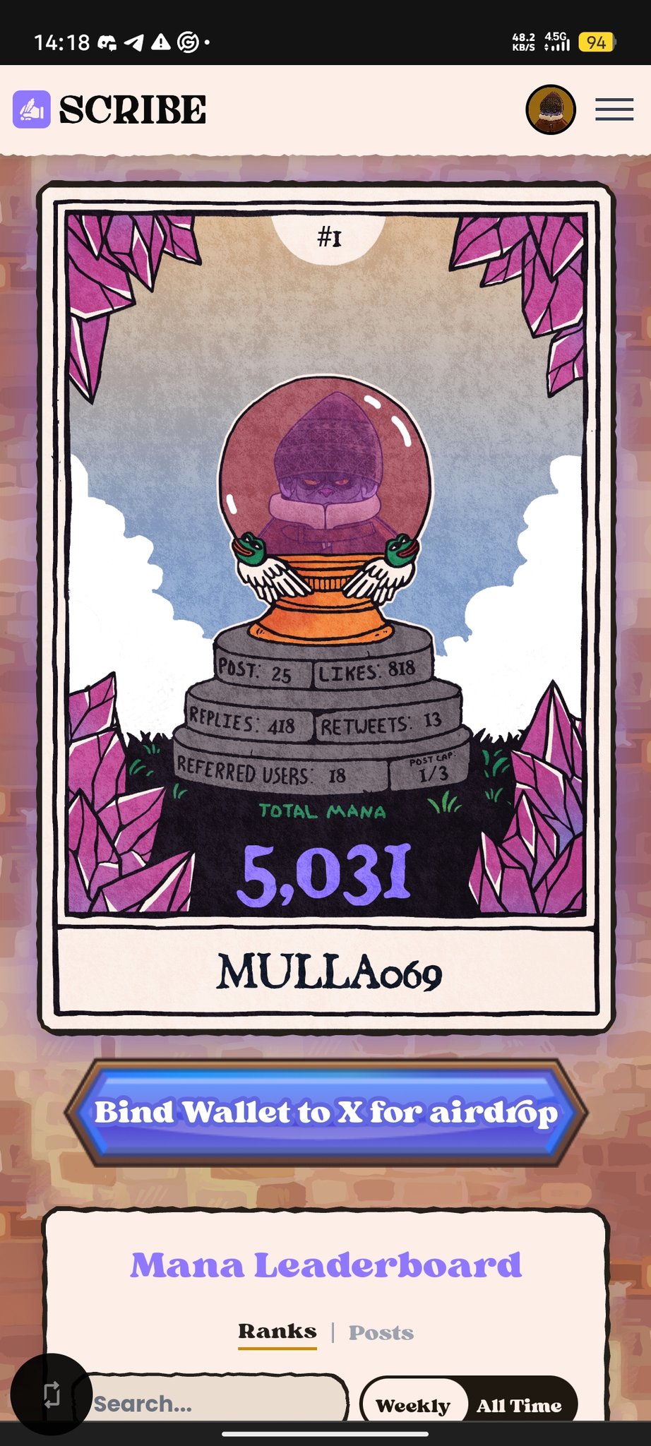 Yesterday I touched 52K MANA on Scribe. Today I crossed 54K MANA again 🔥 Next stop? 60K+ MANA just to remind the space we don’t CHASE CLOUT. CONSISTENCY > NOISE @MysticDaoSol energy DIFFERENT 💜 Would you like me to host a space and discuss about the whole scribe stuff ? https://t.co/niX9UpH2N0