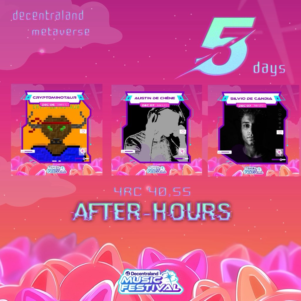 5 Days Until The Doors Swing Open Metaverse After-Hours Live 🪩 🔥 @crypt0m1notaur ⚡️ @AustinDeChene 🌙 @SilvioDeca 🔊 LIVE: Dec 6 — 10PM EST Dec 7 — 3AM UTC 📍 @decentraland (40,55) 4RC Night Club build by @MetaLuke1984 x @meangreendoge https://t.co/GyCM32TEQb