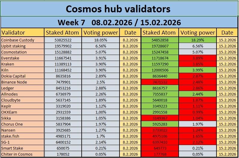CosmosBG Degen Fight Club⚛️☯️🏴☠️🧪⚡️ 🛰 TA_Analyst DeFi_Expert B1.94K @IvanM10529875Cosmos Hub ( $ATOM ) Network Snapshot – February 14, 2026 ⚛️📈 Fresh on-chain pulse from the @cosmos Hub. Price holding steady around $2.20, staking ratio climbing to new highs, and governance heating up with a major upgrade proposal live. Here’s the full breakdown: 1. Core Network & Market Stats - Total Supply: 493,302,764 $ATOM - Circulating Supply: 493,295,851 $ATOM - Current Price: $2.20 - Market Cap / FDV: $1.09B – $1.10B - Block Time: 5.87 seconds - 24h Transactions: 24,287 successful (82 failed) - Staking APR / APY: 14.77% / 15.9% (30-day avg ~14.93%) - Percent Staked: 61.50% (new ATH territory) - Total Staked: 303.19M $ATOM (~$667M) 2. Growth & Activity - Unique Addresses: 1,475,139 (↓125 in 24h | ↓6,257 in 7d) - Unique Delegators: 1,131,275 (+36 in 24h) - 24h Active Addresses: 7,884 - 30-day Rolling Active Addresses: 946,860 - Total Stake Change: +0.1457% (24h) | +0.5755% (7d) | +3.5574% (30d) 3. Decentralization Metrics - Gini Coefficient: 0.781 (still concentrated) - Nakamoto Coefficient: 4 (top 4 control >50%) - Top 100 Delegators’ Stake Share: 56.64% - Active Validators: 180 - Validators Below Avg Voting Power: 144 - Inactive Validator Stake: 2.6M $ATOM (~0.87% | ~$5.8M) 4. Undelegation & Liquidity Signals - Unbonding Period: 21 days - Pending Undelegations: ~509K (1d) | ~1.6M (7d) | ~7.2M $ATOM (all) - Pending Count: 7,461 - Undelegation as % of Total Supply: 1.47% - As % of Not Staked Supply: 3.81% 5. Liquid Staking (Last 24h) - Total Liquid Staked: ~6.13M $ATOM (↓370K) - Stride: ~3.49M $ATOM (dominant, ↓379K) - Drop: ~2.62M $ATOM (+1.2K) - Quicksilver: ~18.5K $ATOM → Net outflows continue, but Drop showing slight resilience. 6. Token Burn Activity - Total Burned to Date: 50,147 $ATOM (~$217K at current price) - Last 30 Days: 1,311 $ATOM - Last 7 Days: 324 $ATOM - Today: 34 $ATOM - Largest Burn Day: 153 $ATOM (Dec 4, 2025) → Steady deflationary pressure building. 7. Top Validators by Voting Power 1. Coinbase01 – 18.25% (~54.9M $ATOM) | 20% commission 2. Upbit Staking – 6.61% (~19.9M) | 100% commission 3. Cosmostation – 5.07% (~15.2M) | 5–20% 4. Kiln – 3.99% (~12.0M) | 8–20% 5. Everstake – 3.90% (~11.7M) | 8–20% 6. Kraken01 – 3.86% (~11.6M) | 10–20% 7. DokiaCapital – 2.87% (~8.6M) | 15% 8. Ledger by Chorus One – 2.87% (~8.6M) | 7.5% 9. Blockdaemon – 2.71% (~8.2M) | 10% 10. Binance Node – 2.49% (~7.5M) | 5% 8. Governance Proposals Live - #1024: Gaia v26.0.0 Upgrade – In Voting | 4,733 votes | 89 validators | 34.76% Yes | 1d 20h left 🌐Link: https://t.co/Fw0Qvyg227 - #1023: Recover IBC Client for Bostrom – Rejected 9. Weekly Pulse (Feb 1–7) - Price: $2.00 (+3.1%) - Active Addresses: 84,860 - Transactions: 220,653 - Burned: 366.6 $ATOM - Stake: 301.4M (+0.8%) - Undelegations: 7,850 (124.6K $ATOM) - Gini / Nakamoto: 0.779 / 4 10. Top Addresses (by balance) 1. bonded_tokens_pool – 299.9M $ATOM (60.8%) 2. distribution – 25.3M $ATOM 3. cosmos1p3ucd... – 22.5M $ATOM ... (many large wallets & pools) Quick Takeaway $ATOM at $2.20, MC $1.09B, staking at 61.5% (highest in months), APR still juicy ~15%. Burn is ticking higher, liquid staking seeing outflows, but Nakamoto at 4 remains a decentralization watchpoint. Major Gaia v26 upgrade voting now – could be a catalyst. Sourse: @SmartStake Is Cosmos finally waking up? Or still in accumulation? Drop your thoughts 👇 #CosmosHub #ATOM #CosmosEcosystem #CryptoStaking #DeFi #Blockchain #TokenBurn #LiquidStaking #Web3 #OnChain