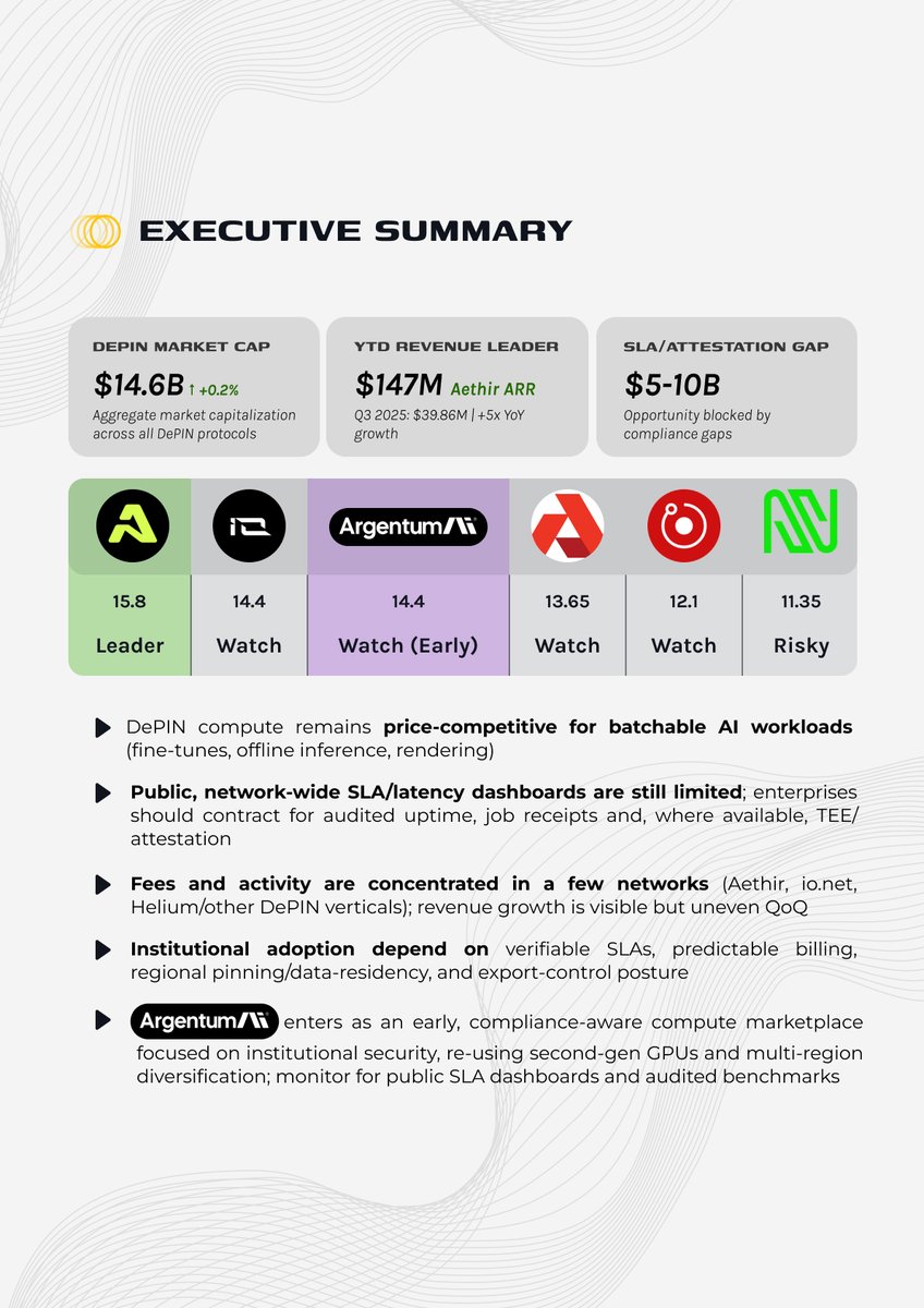 DARC by Solus Group D1.27K @solus_partnersResearch: Computation DePIN (Nov 2025) Key Findings: ▫️ DePIN growth is real (YoY fees did ~5x) but concentrated in a few networks (Aethir, ionet, Helium) ▫️ Top 3 protocols by Comparative Scoring: @AethirCloud (Leader), @ionet (Watch), @Argentum_AI (Early Watch) ▫️ @Argentum_AI: early entrant, that targets two gaps - reuse of second‑gen GPUs and security/region diversification for institutions ▫️ Attestation and SLA dashboards are the primary adoption bottlenecks for regulated buyers Full report: https://t.co/NEZKQhVEEE Authors & Contributors: @0xfrigg, @0xSalazar, @rektonomist_, @obchakevich_, @crypto_goos, @rukizcukiz, @Dillion_Empire, @KongBTC, @zenbirb, @LisaFlorentina8, @cryptobrass, @leshka_eth, @CryptoGideon_, @Eliteonchain
