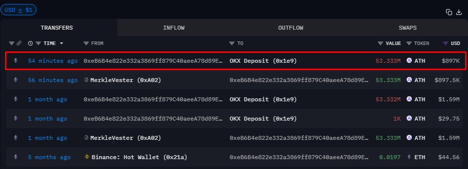 onchainschool.pro OnChain_Analyst Educator S4.46K @how2onchain$ATH VESTING TOKENS MOVING AGAIN 1 hour ago, $ATH tokens worth $897K were withdrawn from the vesting wallet and sent to the OKX exchange This has been happening consistently for the past 2 months, around the 20th of each month, with similar amounts being moved It’s worth monitoring this wallet for large token outflows The wallet still holds $115M worth of tokens Vesting wallet: 0xA02ba54a0F9840BD286dDF1b4A9c5dE08d8D8bBE