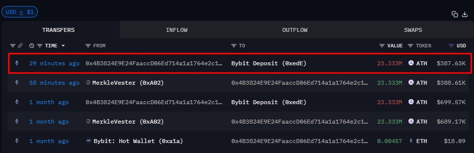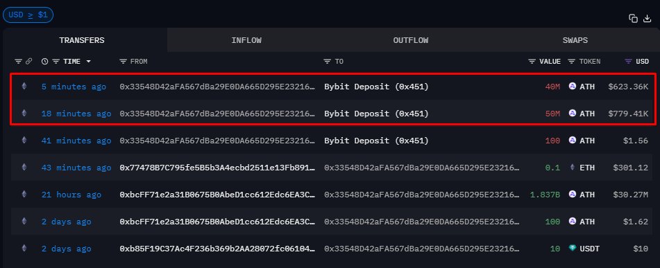onchainschool.pro OnChain_Analyst Educator S4.46K @how2onchainNEW $ATH WITHDRAWALS FROM TEAM WALLETS Less than 30 minutes ago, $1.4M worth of $ATH was withdrawn to Bybit Just yesterday, this wallet received $30.3M worth of $ATH, and today the outflows have already started The wallet is currently holding $27.3M worth of tokens Wallet: 0x33548D42aFA567dBa29E0DA665D295E232166a43
