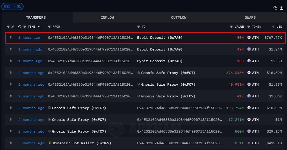 9 2 1.63K Original >Trend of ATH after releaseBearishThe ATH team wallet has transferred tokens to Bybit for two consecutive months, most recently moving $768K, indicating potential selling pressure.