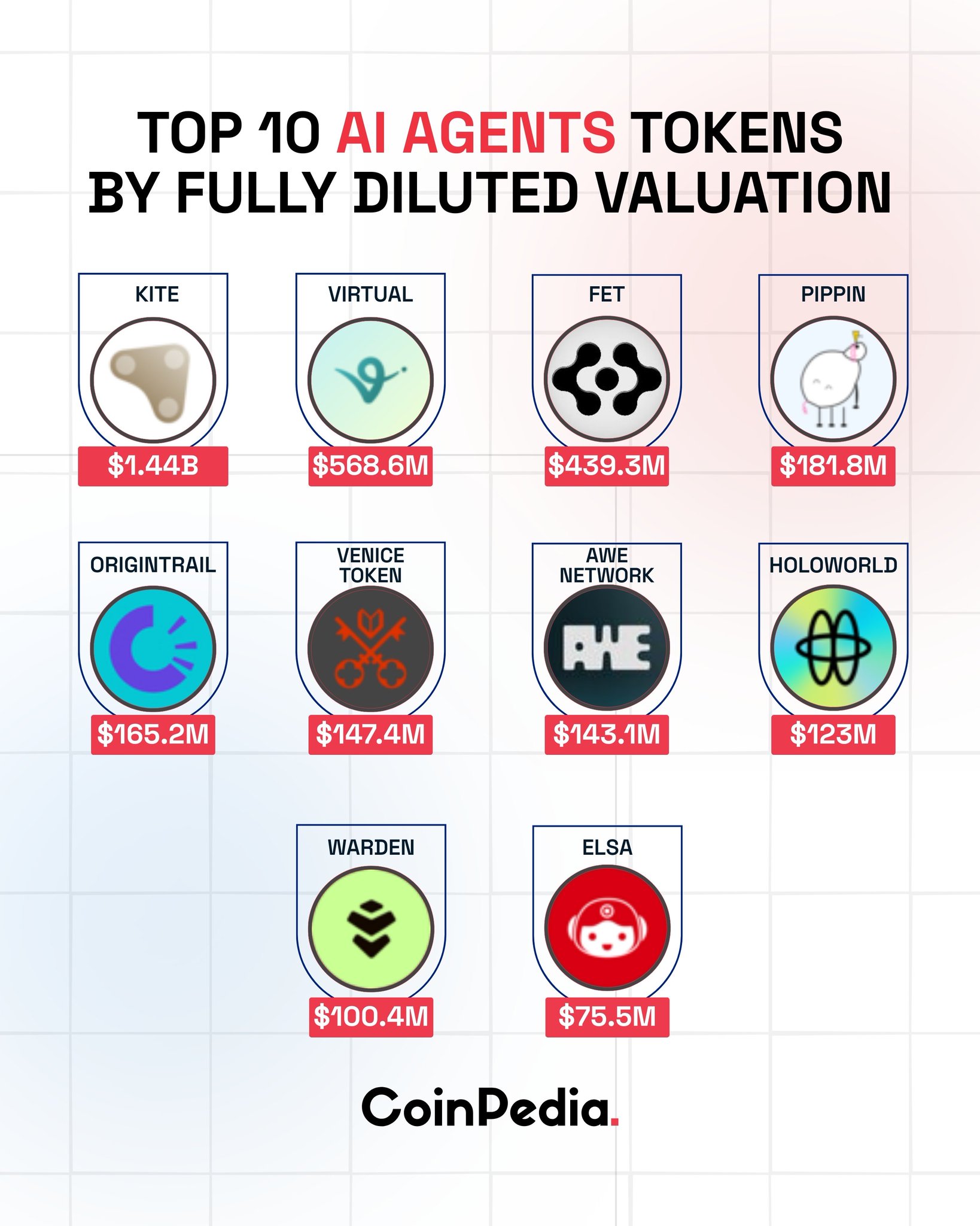 Coinpedia released the top 10 AI agent tokens ranked by FDV, with KITE leading at $1.44B.