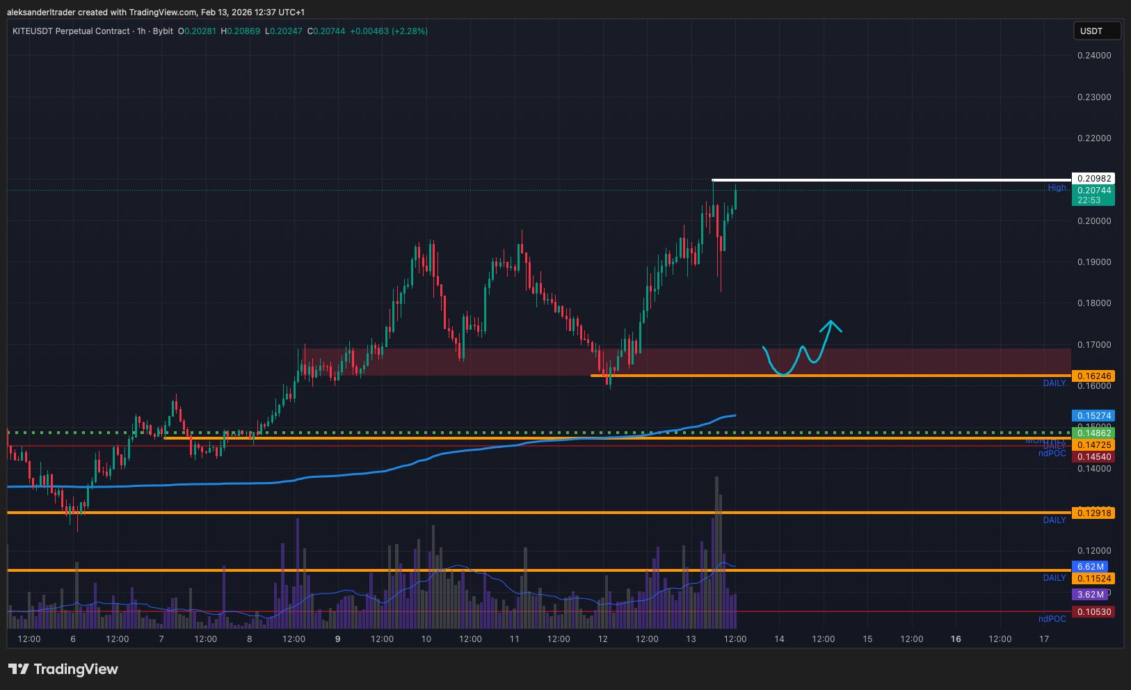 KITE正在关注0.169-0.163美元的关键支撑区,预期在此获得支撑后上涨。