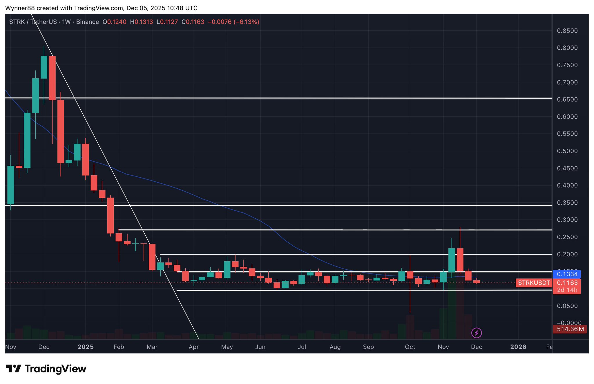 $STRK between $0.1 & $0.2 is pure accumulation zone. I've been accumulating this and $EKUBO for most of 2025 and I'll continue to do so whether bull market or bear. Study @Starknet and @EkuboProtocol. https://t.co/BQTAUDtcKN