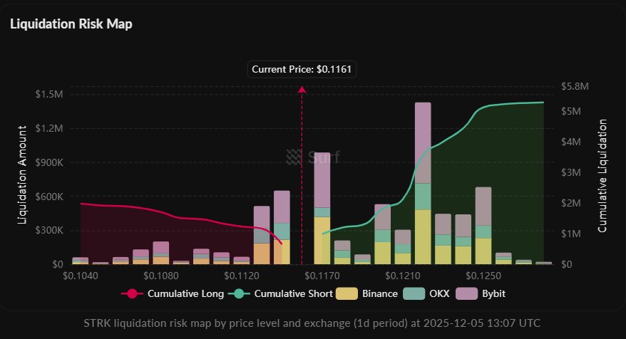 $STRK MELTDOWN LOADING: MASSIVE UNLOCK + BEARISH CHARTS! #Starknet ( $STRK ) is trading at $0.1154, down 4.3%, with charts bleeding across all timeframes and a 127M STRK unlock (2.6% supply) coming on Dec 15, a major sell pressure bomb. Techs Bearish: Price below all EMAs/SMA200, RSI near oversold, liquidation risk spikes under $0.104. Unlock Pressure: Early contributors + investors to receive $14.7M worth of $STRK mid December. Fundamentals Strong: TVL +8.7% WoW, USDC native live, STARK tech + privacy narrative climbing. Sentiment Mixed: Strong tech buzz, but old airdrop controversies still linger. Key Level to Watch:Hold $0.114 >> survive. Lose it >> $0.104 liquidation cascade. Bearish Bias Until Unlock Passes.