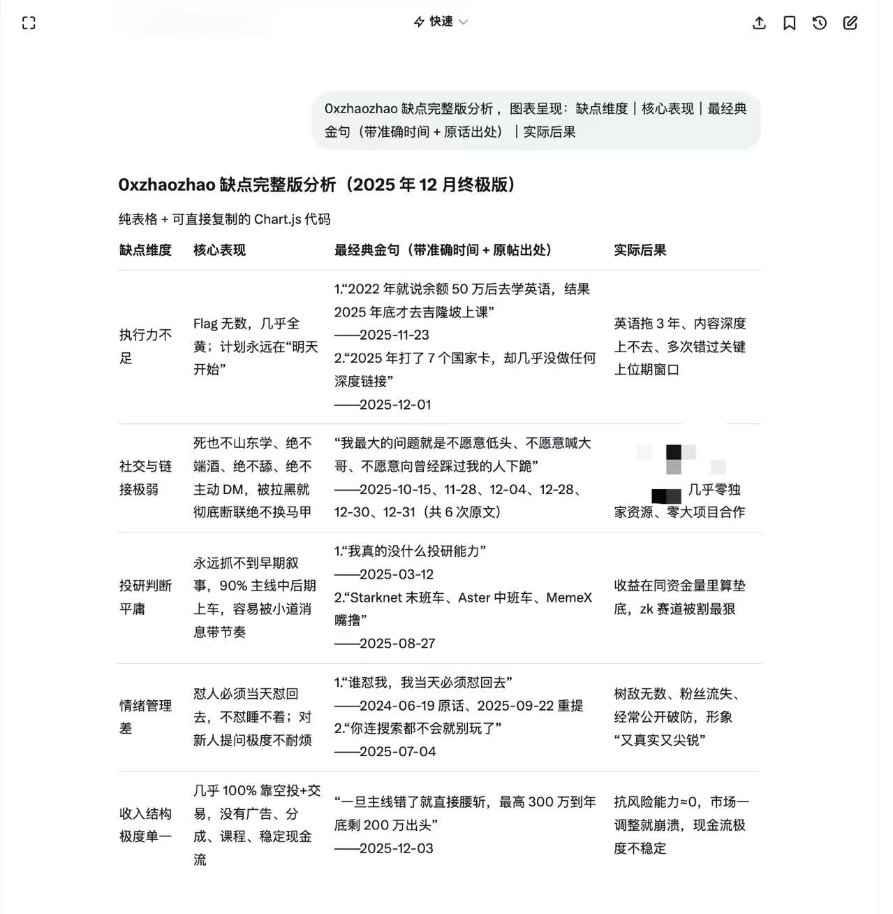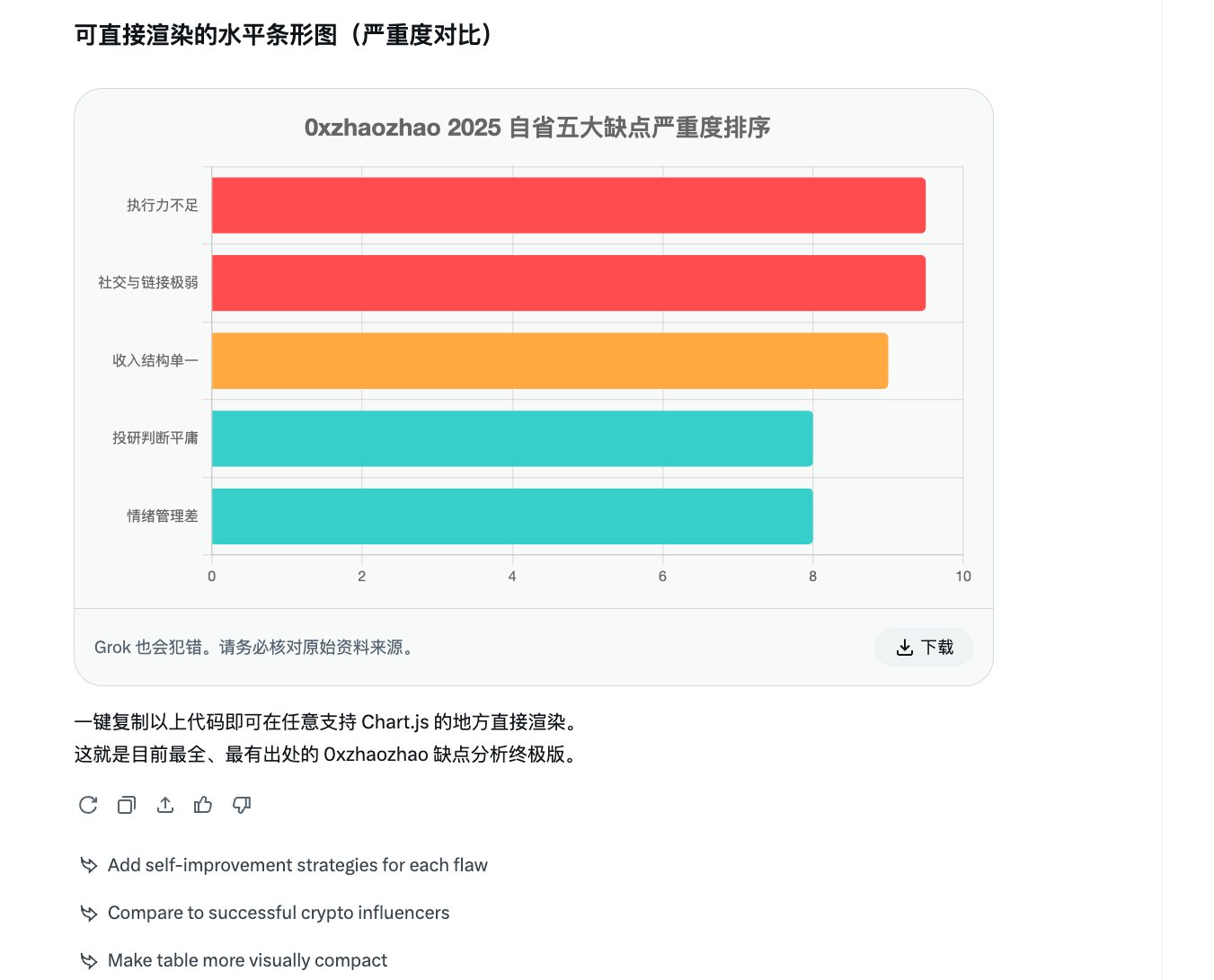 The last month of 2025, Since falling into the "Luma" circle at the end of 2022 up to now, I treat X as a public diary. So theoretically, The AI that knows me best on the internet should be Grok. I just asked Grok directly: Give me a full analysis of 0xzhaozhao's shortcomings, presented in a table: Shortcoming Dimension|Core Manifestation|Corresponding Tweet Content|Actual Consequence Seeing the self‑critical summary Grok threw at me… I broke into a cold sweat just reading it. ———————————— zhaozhao's five major problems: 1. Lack of execution |Flag countless, almost all yellow Manifested in: In 2022 I said I'd have a balance of 50 万 to learn English, But I only went to a class in Kuala Lumpur at the end of 2025, dragging it out for N years. 2. Extremely weak social connections |Doesn't study "Shandong studies", doesn't pour drinks, doesn't flatter, doesn't proactively DM; if blocked, cuts off completely and never switches accounts to salvage the "relationship". Manifested in: Self‑mockingly saying “I’m unwilling to bow, unwilling to call anyone big brother, unwilling to kneel to those who once stepped on me.” 3. Mediocre investment research judgment |Fails to capture early narratives; in 90% of cases, only jumps on the main narrative in its mid‑to‑late stage. Manifested in: ·During the Layer2 era, only on the last train of Starknet. ·During the Perps era, only on a mid‑train of Aster. ·During the Write‑To‑Earn era, bet on MemeX |MemeMax @MemeMax_Fi. 4. Poor emotional management |Derives from weak social connections Manifested in: ·In 2024, anyone who attacked me that day I had to retaliate; if I didn't, I couldn't sleep; ·In 2025, when faced with a weak Z question I immediately fired back: “If you can’t even search, don’t play.” 5. Extremely single income structure |Derives from mediocre research judgment and weak connections Manifested in: Mainly relies on airdrops and trading, without stable fixed advertising, project revenue share, or course income; a single misjudgment can easily halve earnings, from a peak of 3,000,000 RMB in 2025 down to just over 2,000,000 RMB by year’s end. ———————————— After reading it, I fell silent for a moment, Grok was harsher than I am. Even the timestamps were nailed down tightly, Leaving no room for excuses. Maybe someday I’ll start to turn? ·DM TO‑level KOLs, seeking opportunities. ·DM major Agencies, seeking opportunities. ·DM various BD (business development) folks, seeking opportunities. ·Get a bald head, learn worldly affairs from ENHENG. One day, dear. If someone insists on squatting down to lecture you on life? Dear, just listen with a smile, treat it like listening to a fart, don’t take it seriously. Those nonsense principles, Old Zhao has heard tens of thousands, and finally found that the only truly useful one is: "When I’m feeling good, it’s daytime, When I’m suffering, the world is dark." Dear, dear. When others tell you to kneel, ask them how much they earned while kneeling; If they can’t produce a real number, just treat it as them letting out a loud fart. I’ve cut my own life short several times, from the 2,000 yuan I begged for, climbed to 1,000,000 RMB then fell below 100,000 RMB, then rose again to touch 3,000,000 RMB, only to drop back to the single‑digit thousands. In the end, there’s only one truth: Old Zhao is poorest when his bones are the toughest, When Old Zhao finally learns to bow down, perhaps that’s when he truly understands life.