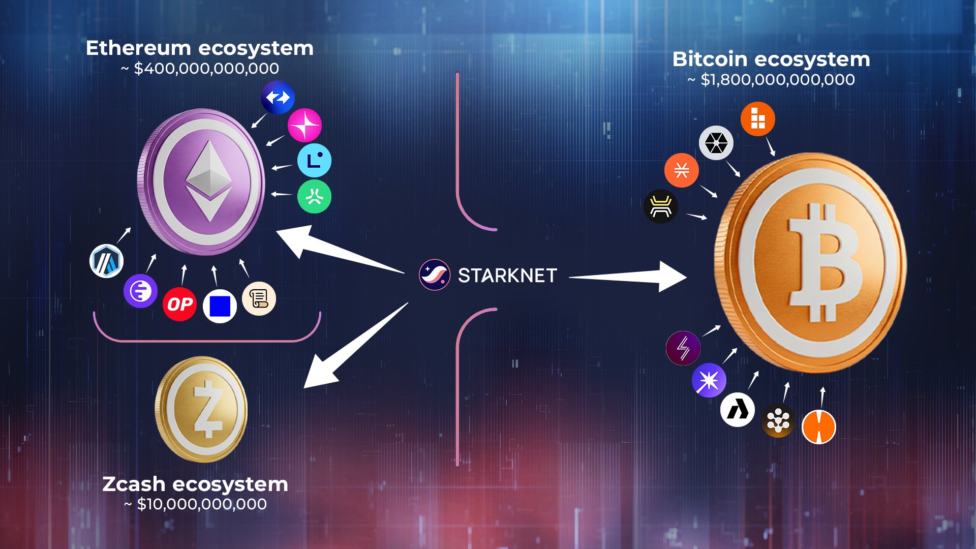 Starknet is positioned as a scaling and privacy engine that connects and empowers the Ethereum, Bitcoin, and Zcash ecosystems.