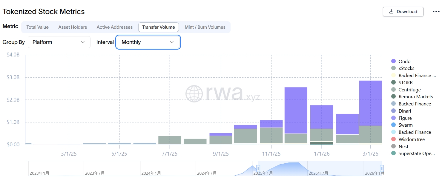 Wu Blockchain Media Influencer D553.44K @WuBlockchainTokenized stock transfers reached $2.87 billion in March, up more than 80% over the past 30 days and marking a new all-time high. Ondo’s tokenized stock transfer volume surpassed $2 billion. Total tokenized stock holders have also exceeded 200,000. https://t.co/b9sFZ71nII
