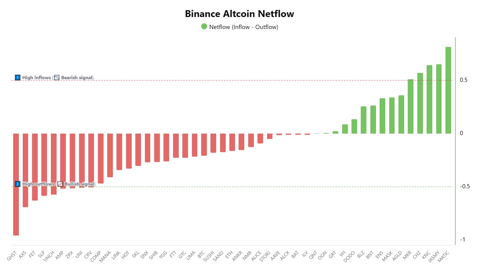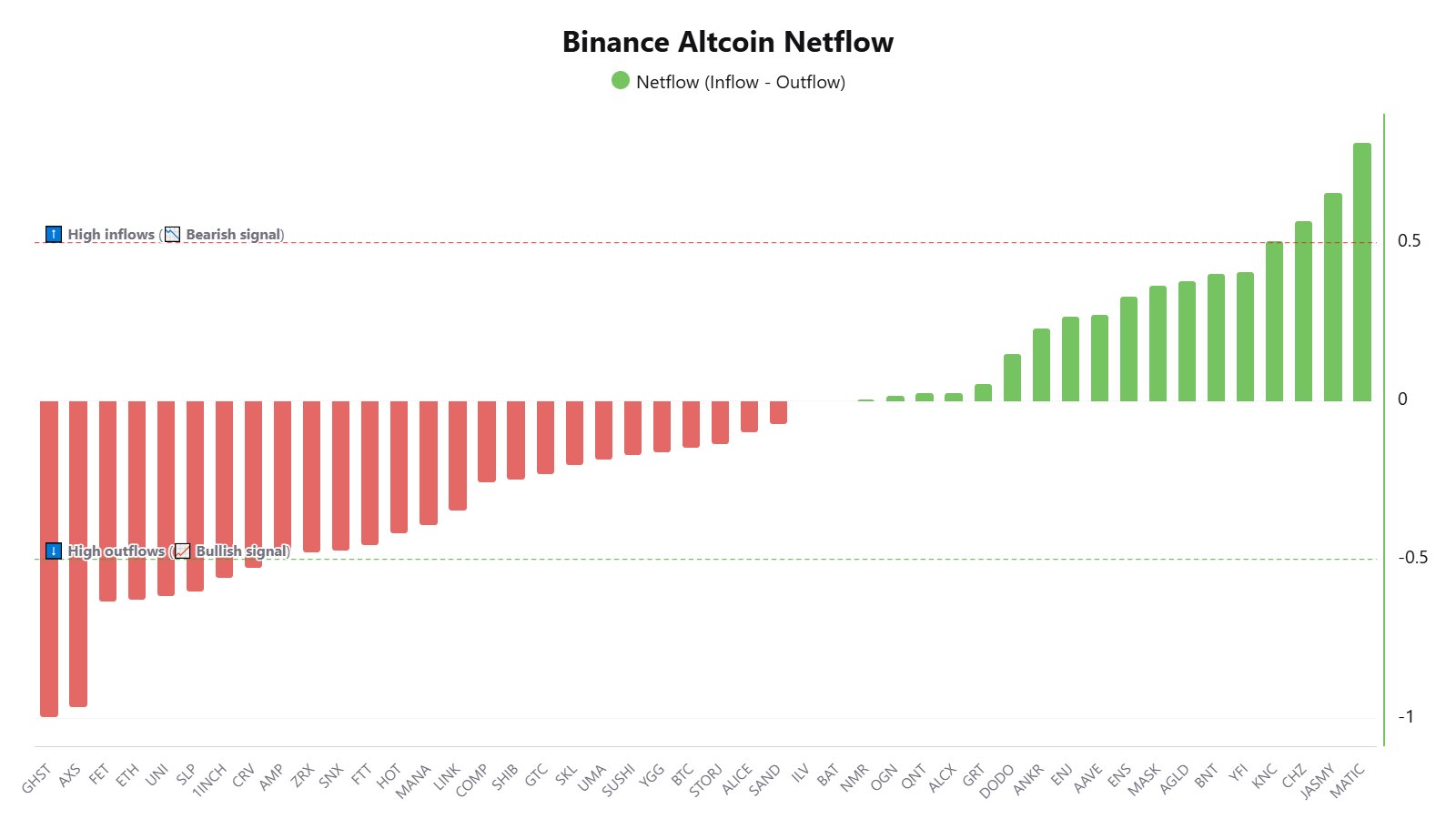 Coins saw outflows from Binance include $GHST, $AXS, $FET, $SLP, $1INCH, $AMP, $ZRX, $UNI, and $CRV. Outflows from the exchange are a signal for accumulation.