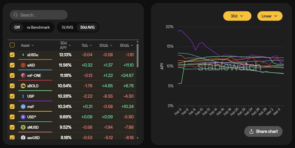 Top 10 stablecoin yield picks by APY (last 30 days, February data):