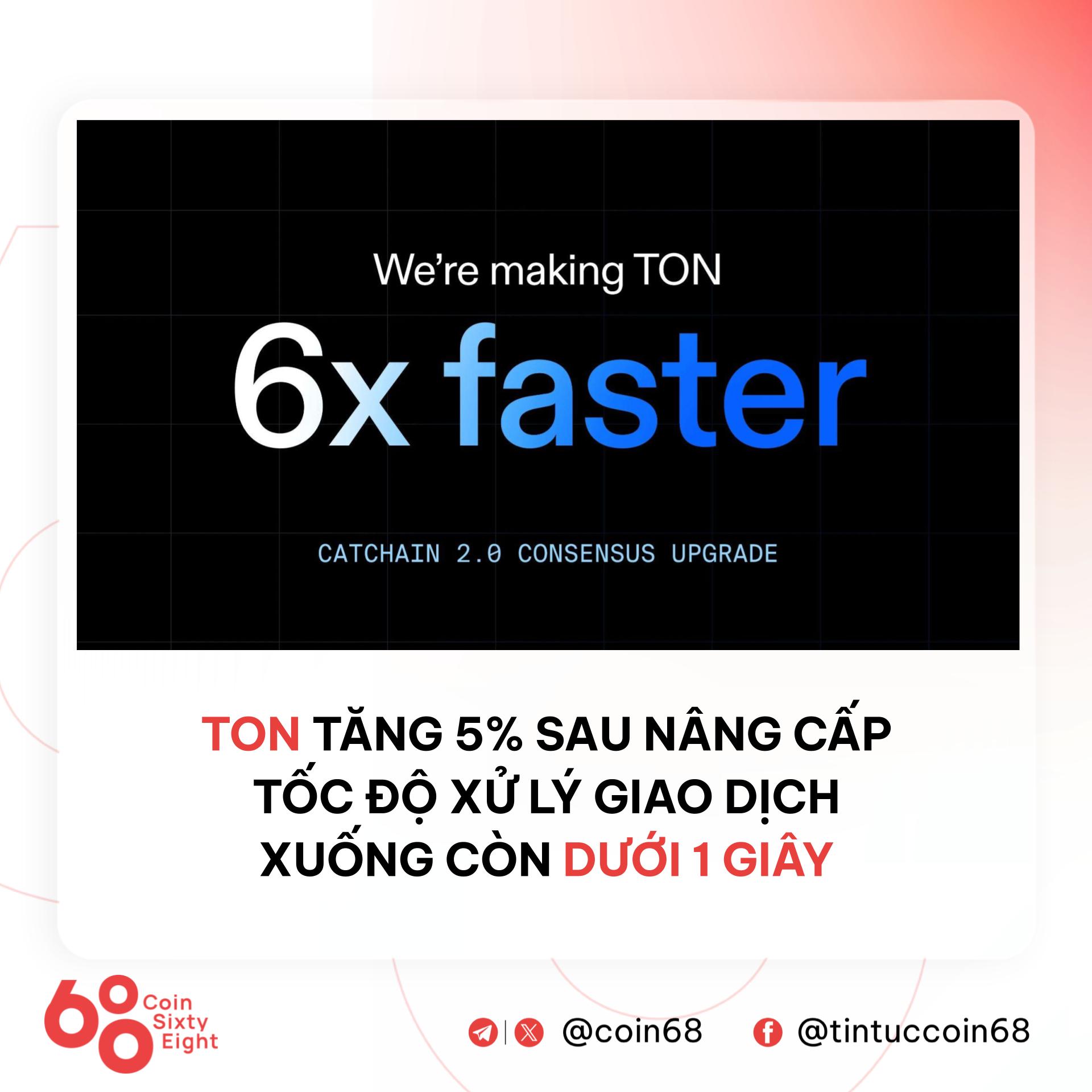 TON completed the Catchain 2.0 upgrade, transaction speed increased 6‑fold, confirmation time below 1 second, token price rose 5%.