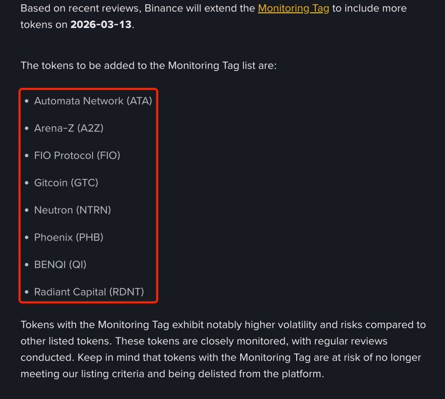 Just a short while ago it announced it will put a Monitoring Tag (Under Monitoring) on a group of tokens starting March 13, 2026.