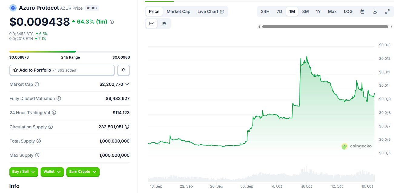 Azuro Protocol (AZUR) is a cryptocurrency launched in 2024and operates on the Ethereum platform. Azuro Protocol has a current supply of 1,000,000,000 with 200,743,303.47153478 in circulation. The last known price of Azuro Protocol is 0.00110616 USD and is up 1.83 over the last 24 hours. It is currently trading on 16 active market(s) with $56,731.83 traded over the last 24 hours. More information can be found at https://azuro.org/.