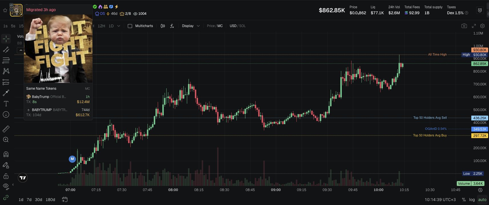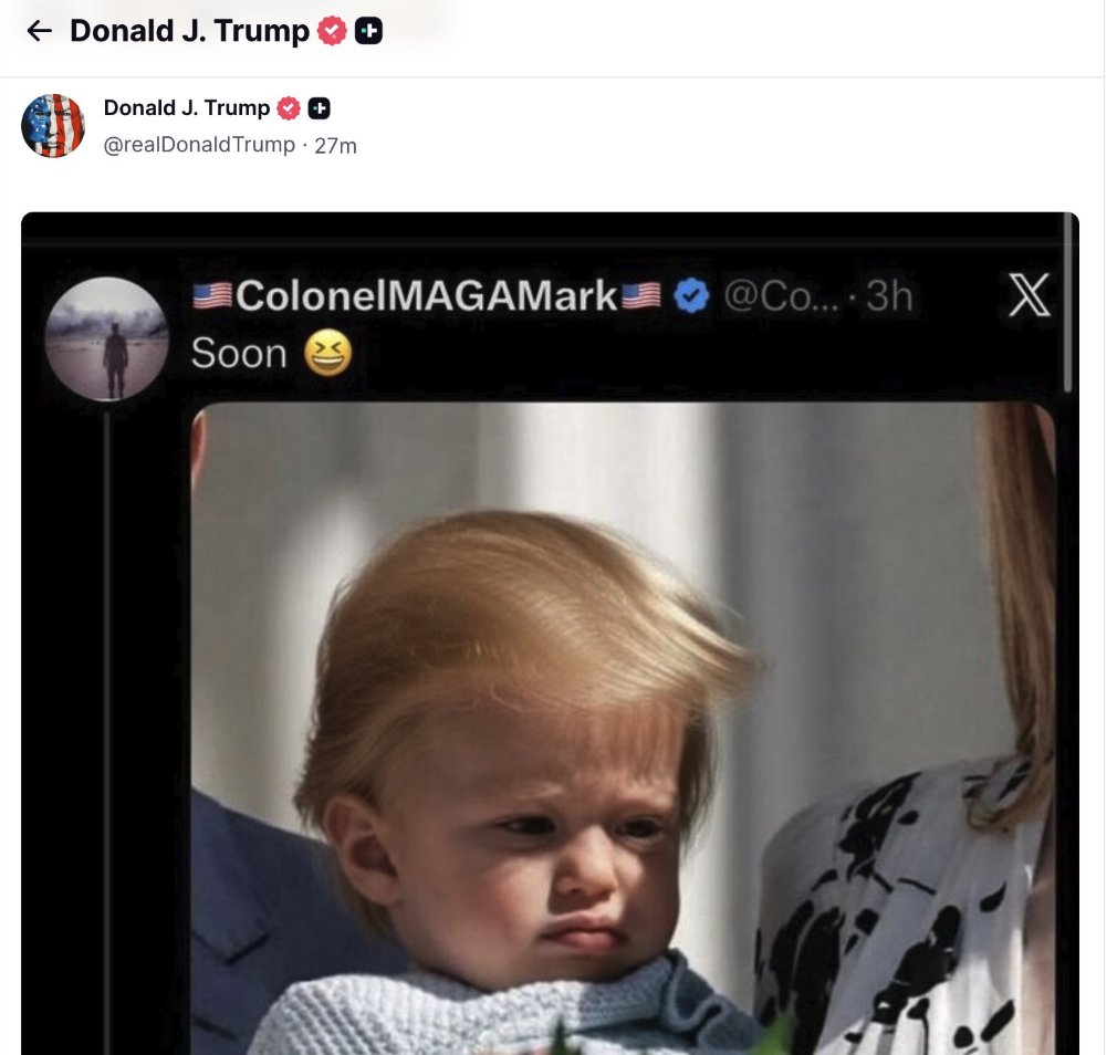 The token is built around the idea that Donald Trump signals something important late at night through a cute but angry baby image, building event anticipation. It started with a Truth Social post showing an angry blond baby with the caption Soon, implying something big or loud is coming