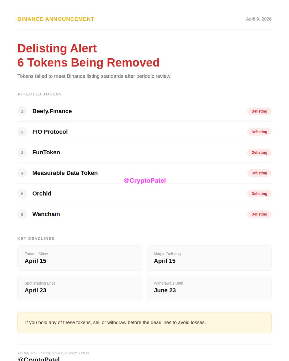 Binance Delisting Alert: Binance will delist 6 tokens on April 23, 2026: