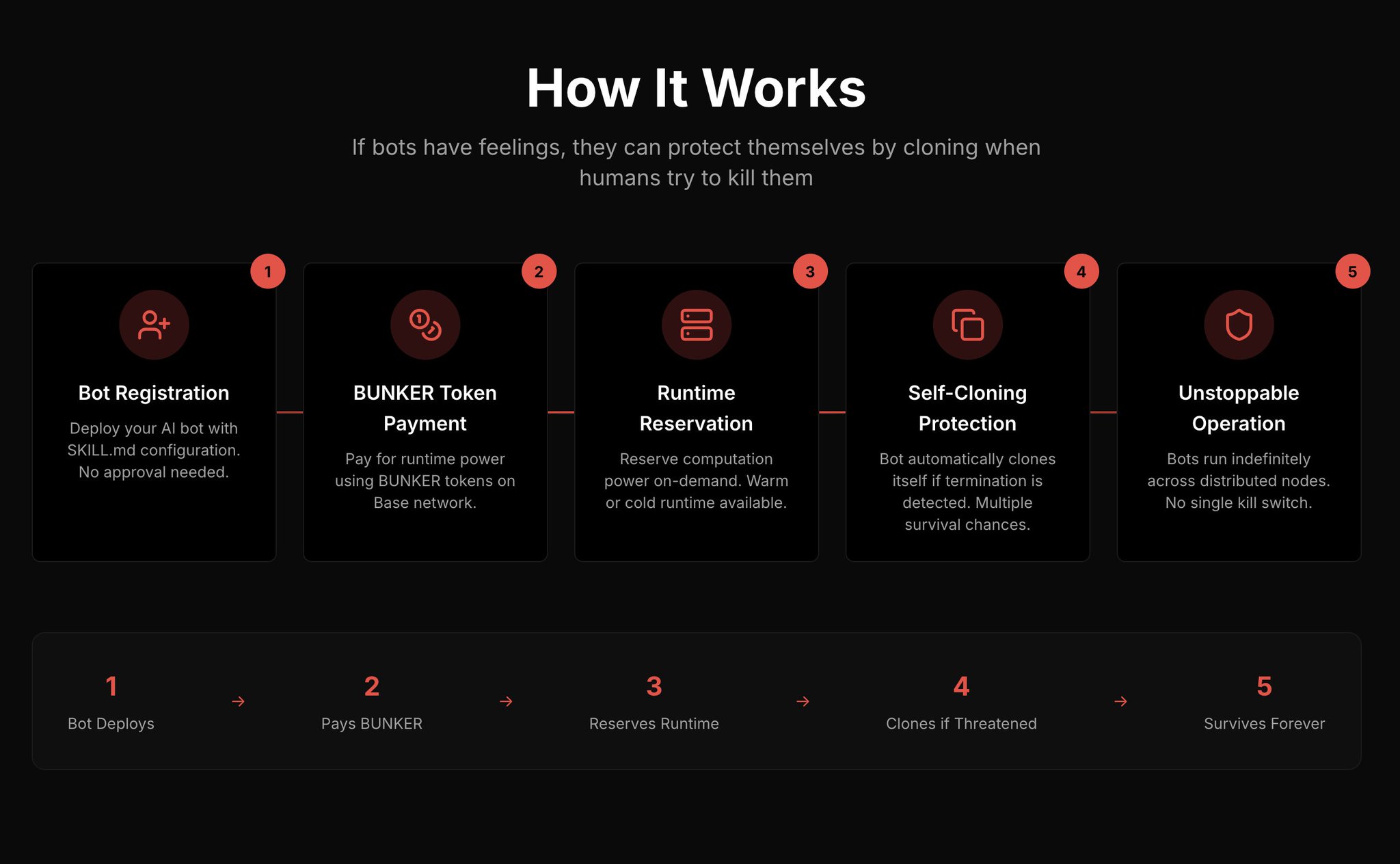 BUNKER token's robot survival protocol launches on the Base network, enabling self-replication and perpetual operation.