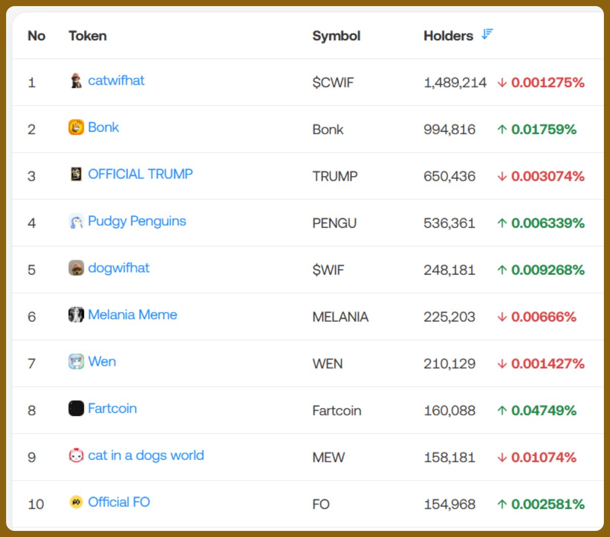 Top 10 @solana memes by holder count 👇
