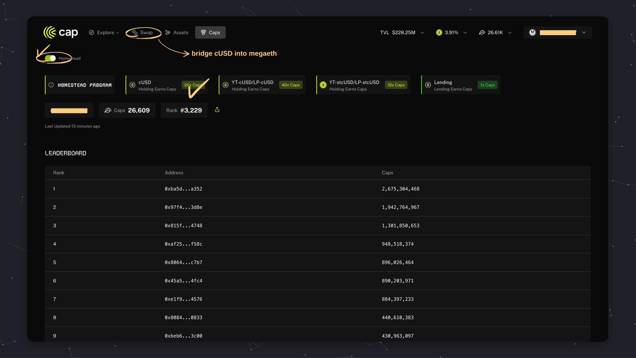 On the megaeth side, I checked cap’s homestead program. This is where you farm caps points.