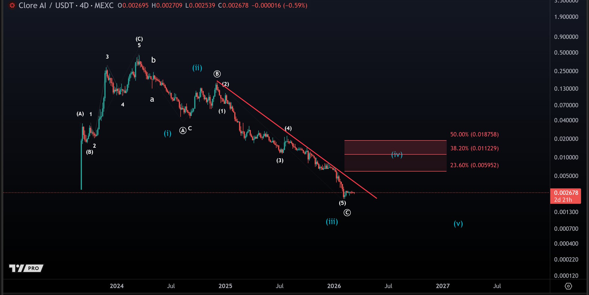 The price has reached new all‑time lows and continues to trade below the red trend line that was highlighted in earlier updates. The price movement still closely follows this downward‑sloping trend line, which defines the overarching downtrend.