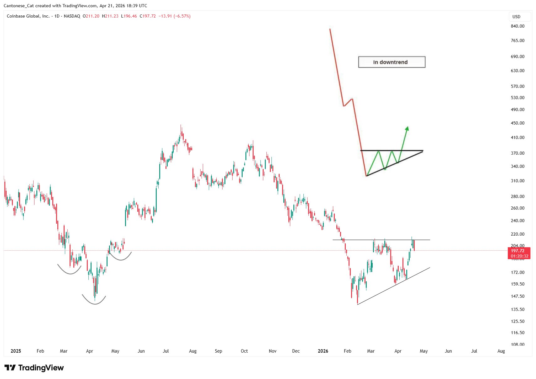 $COIN daily\nBullish formation, but not without pain https://t.co/GQdaK53yFg