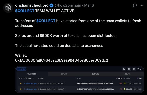 Almost no tokens in circulation except for BNB holders and the team. There have also been reports of team wallets moving $COLLECT team tokens onto exchanges.