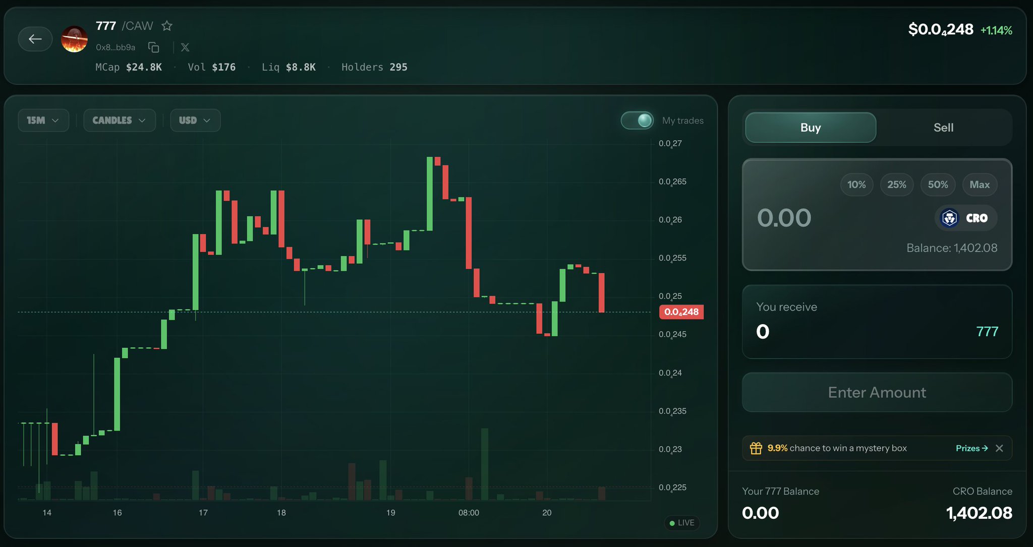 crow with knife (CAW) is a cryptocurrency launched in 2024and operates on the Cronos platform. crow with knife has a current supply of 777,777,777,777,777 with 769,861,397,731,578 in circulation. The last known price of crow with knife is 0.00000001 USD and is down -1.49 over the last 24 hours. It is currently trading on 38 active market(s) with $171,002.02 traded over the last 24 hours. More information can be found at https://www.crowwithknife.com/.