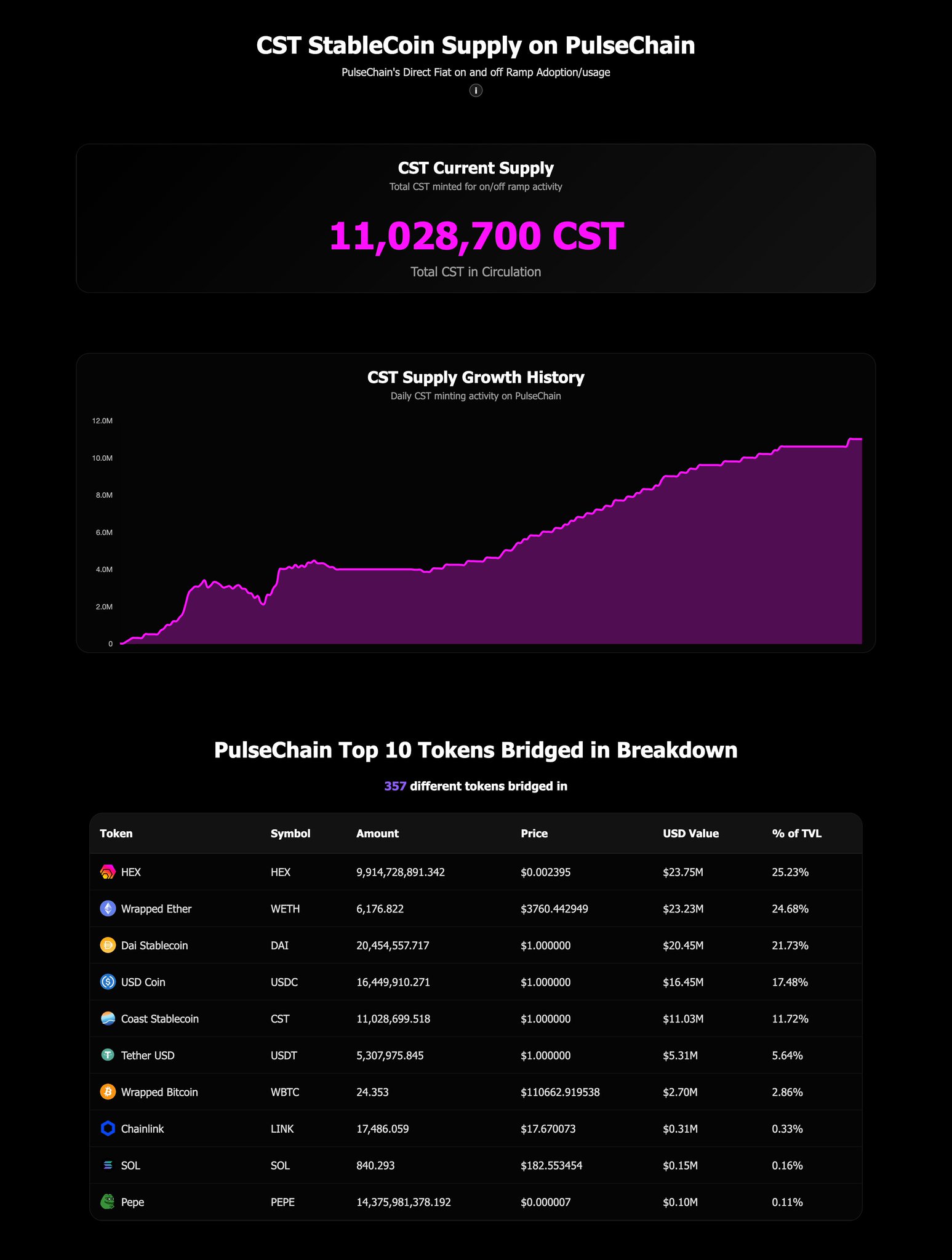 🌟 New StatsWe are now tracking CST @0xCoast direct fiat on and off ramp to PulseChainSo far they have helped bring in $11M to PulseChain!With an additional $400,000 just recently!Track CST helping bring new money into PulseChain Live: https://t.co/2VsQulKwnv https://t.co/9mHYfVR1w