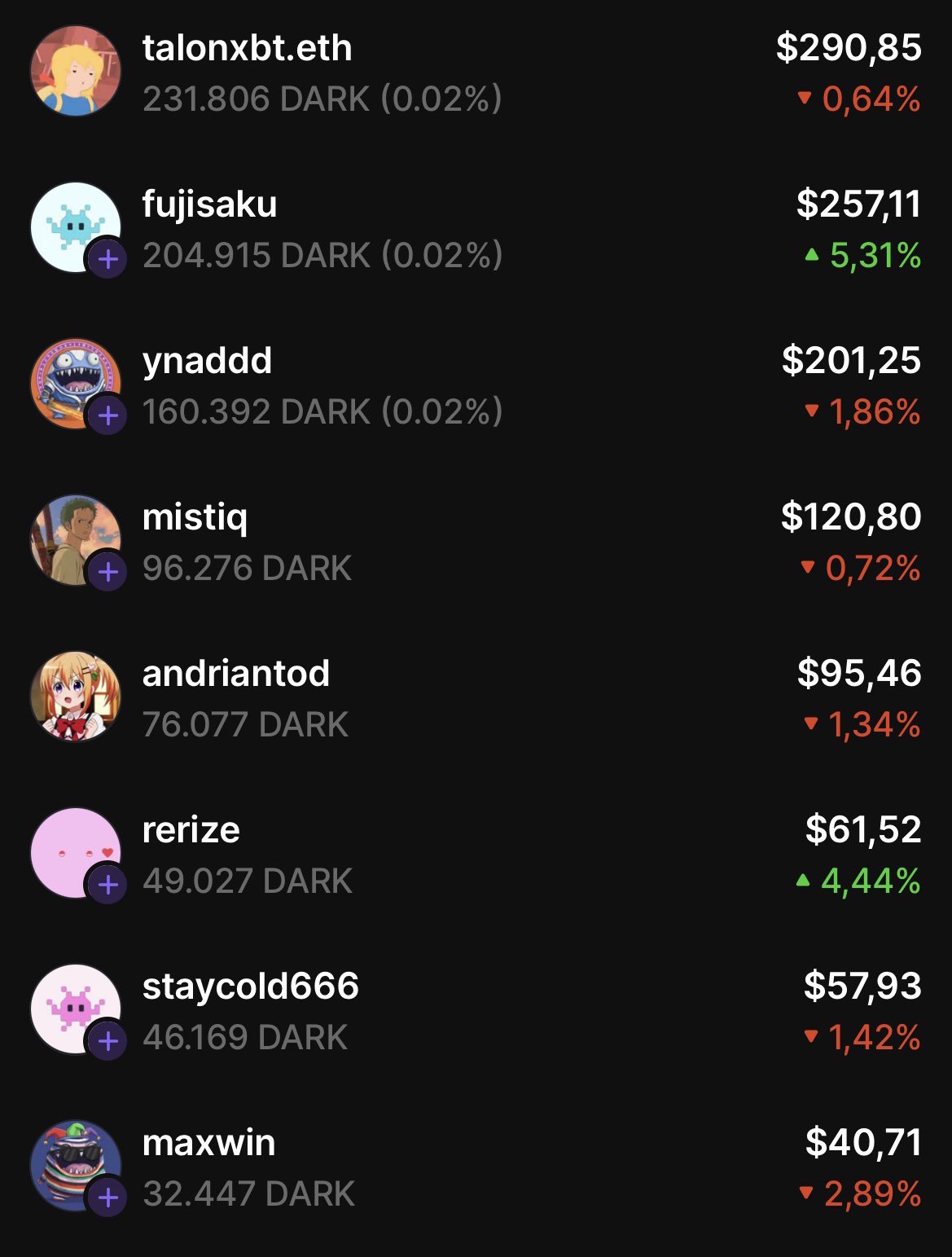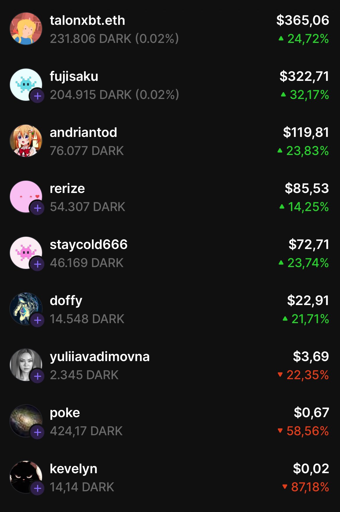 The author shows a before-and-after comparison of DARK token trades, with a significant increase in value.