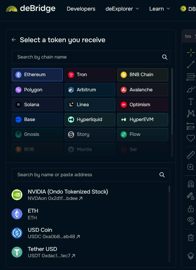 Today I tried deBridge, and tokenized US stocks like NVIDIA, Tesla, Apple can already be cross-chain traded; gold and silver are also supported. For a cross-chain bridge, this category coverage is already very advanced.