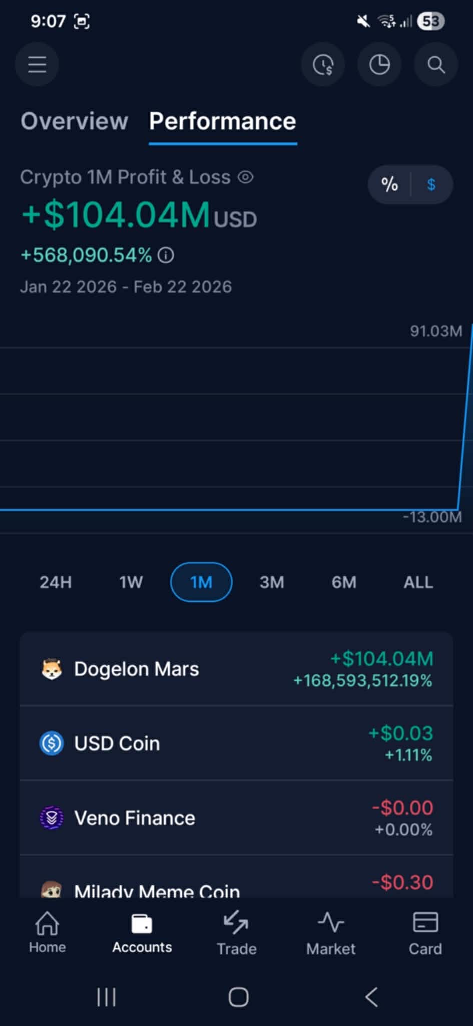How’s this for a dopamine hit and crash… my sister’s friend logged into her exchange account and had Dogelon Mars meme token in her wallet only to discover her account balance was now $104 million. Obviously it’s a temporary display glitch, most likely API or cached error, but what a way to wake in the morning hahaha.
