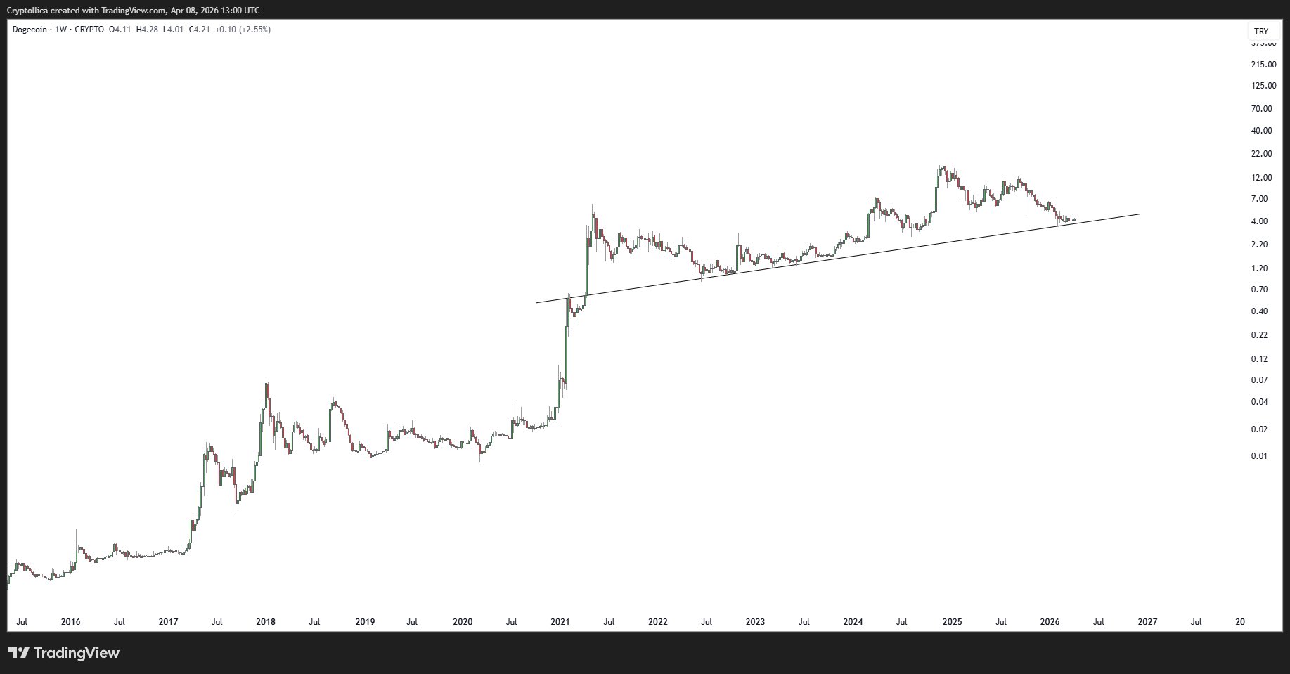 DOGE/TRY price finds support on the long-term upward support line, indicating a potential upward trend.