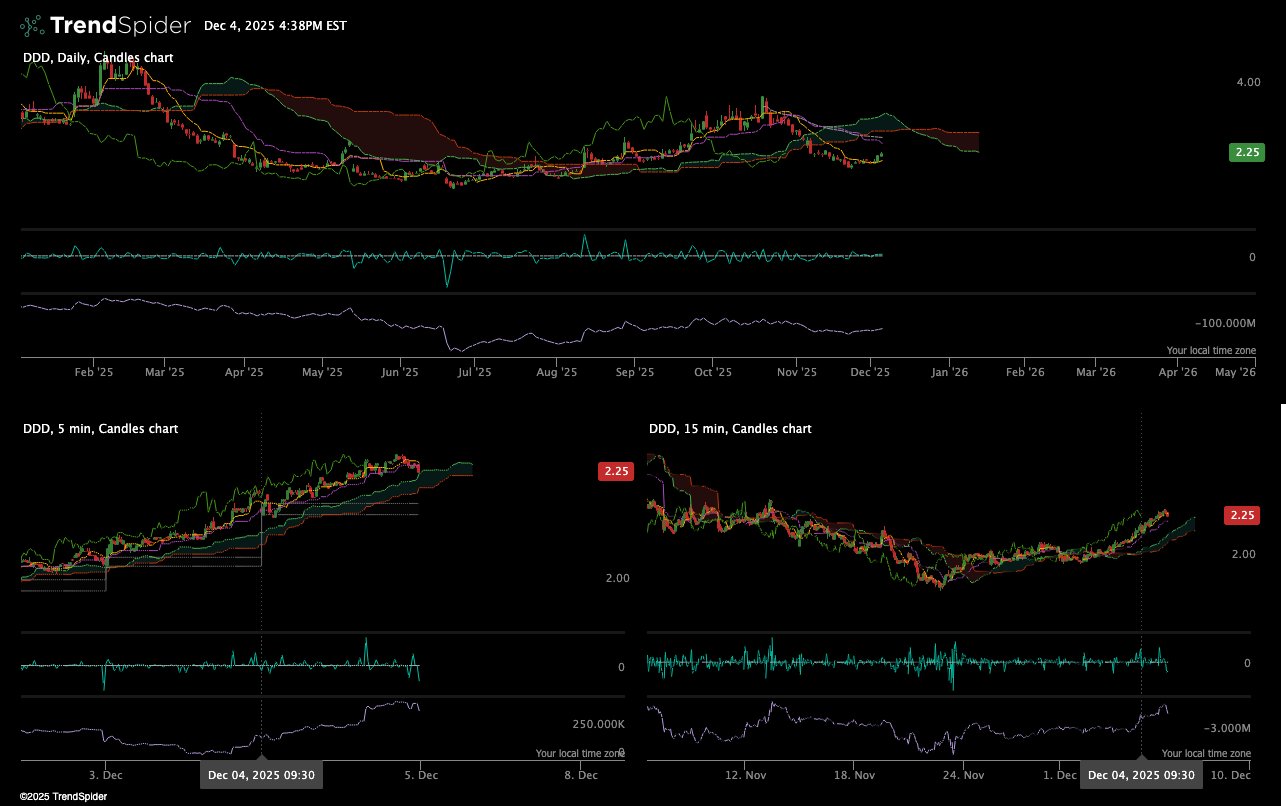 $DDD presents a mixed picture across timeframes. On the daily chart, the stock is in a prolonged downtrend throughout 2025, falling from $4 to $2.25, with price consistently below both the Ichimoku cloud and VWAP anchors. On Balance Volume has been steadily declining since June, signaling weak accumulation and persistent selling.