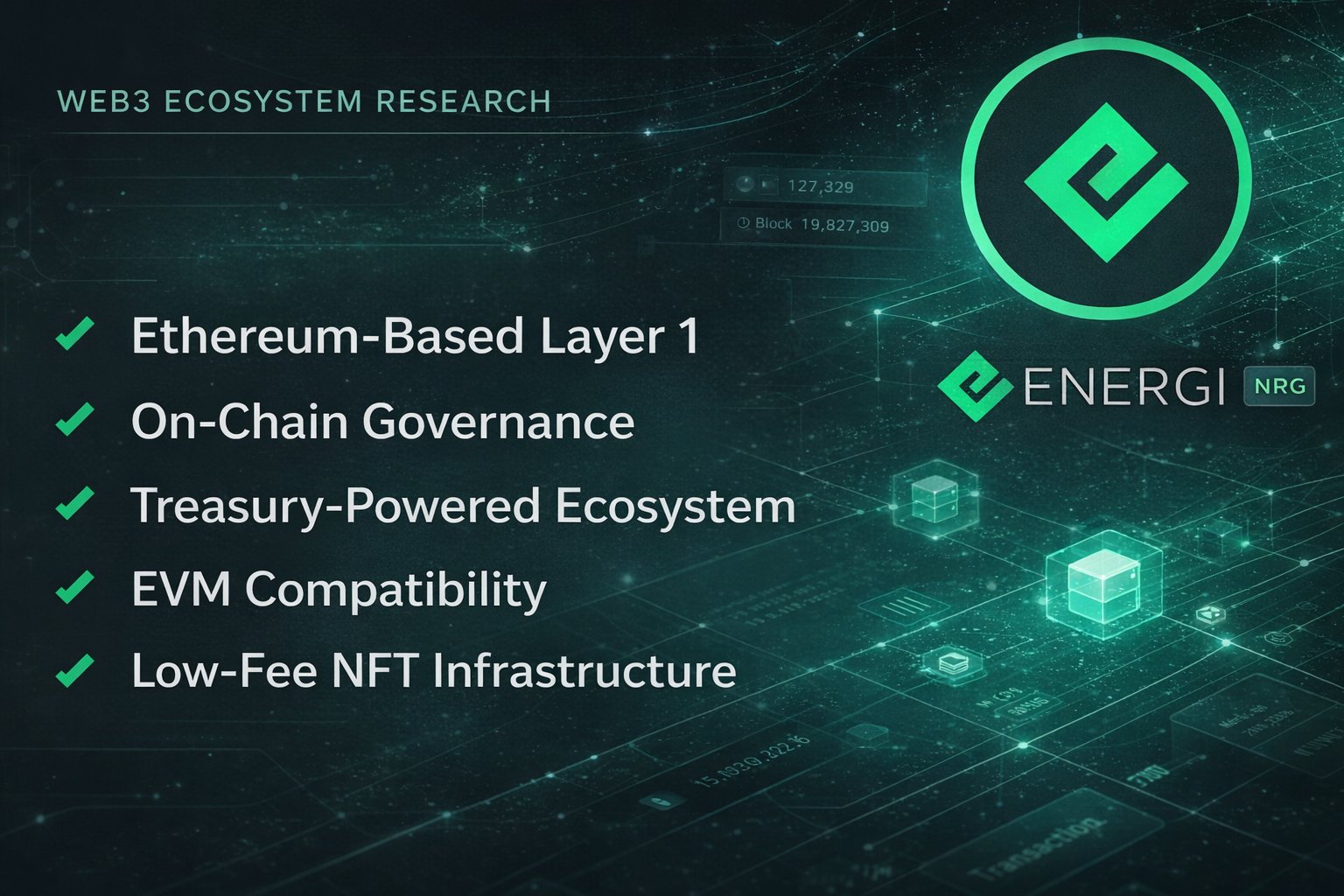@energi is a self-sustaining, Ethereum-based Layer 1 blockchain integrating smart contracts, governance, and a treasury system. It is designed to fund ecosystem growth internally while maintaining full EVM compatibility for decentralized applications and community-driven development.