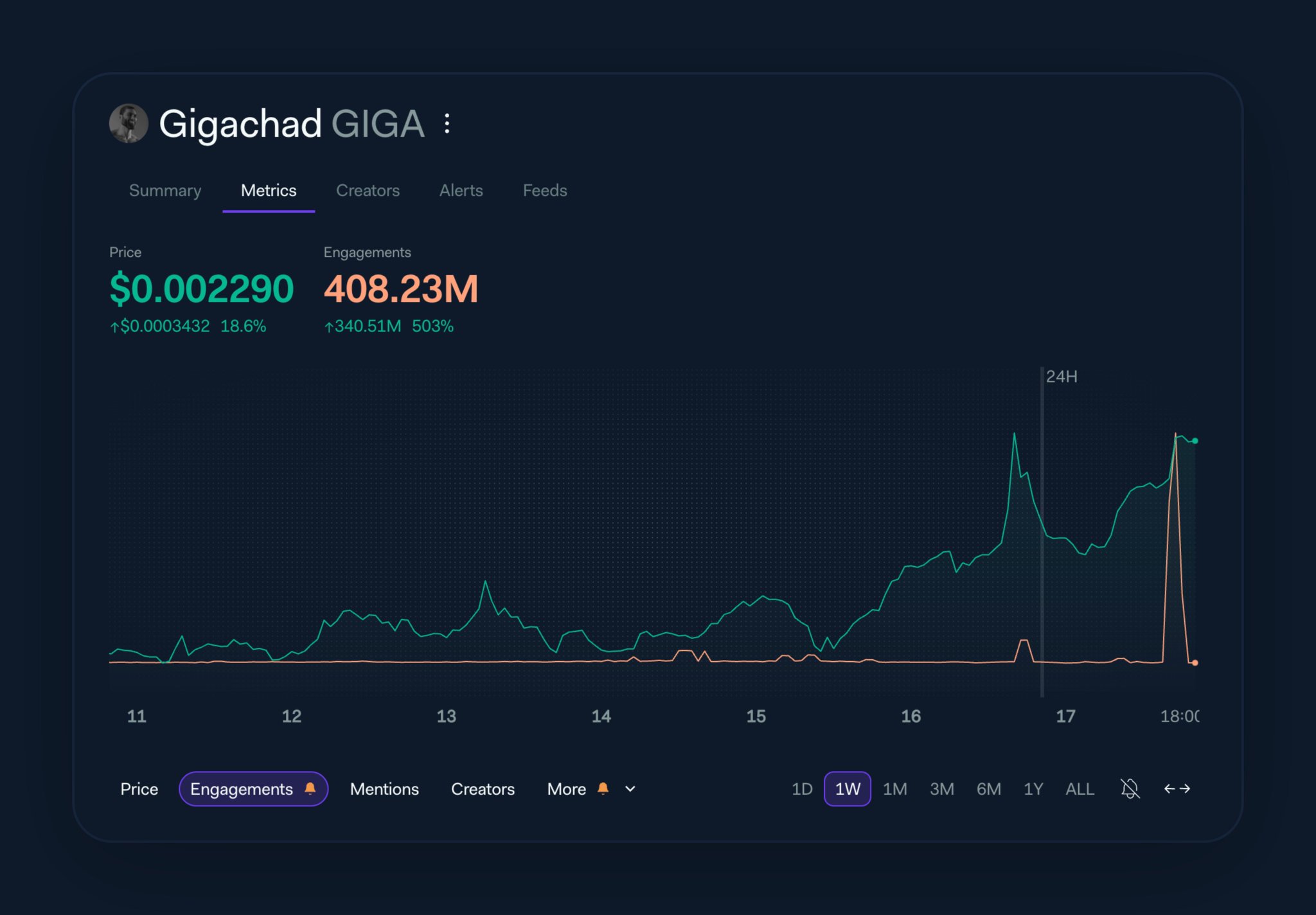 Gigachad posted 161.9M engagements in 24 hours. That's 740% above its daily average. Price moved 5%.