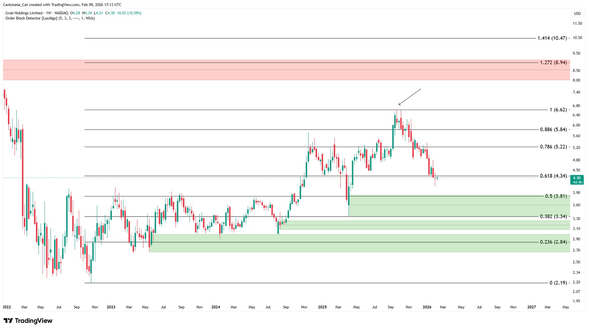 Because of the rejection off 6.6 with a weekly tweezer top, $GRAB is retracing back to lower levels.