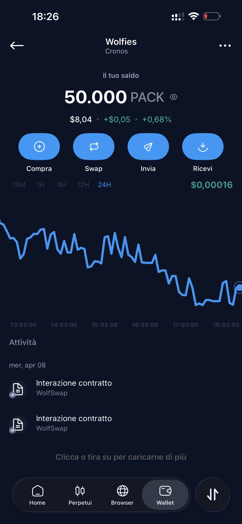 User performs vault operation with PACK token on WolfSwap, wallet shows slight token value increase.