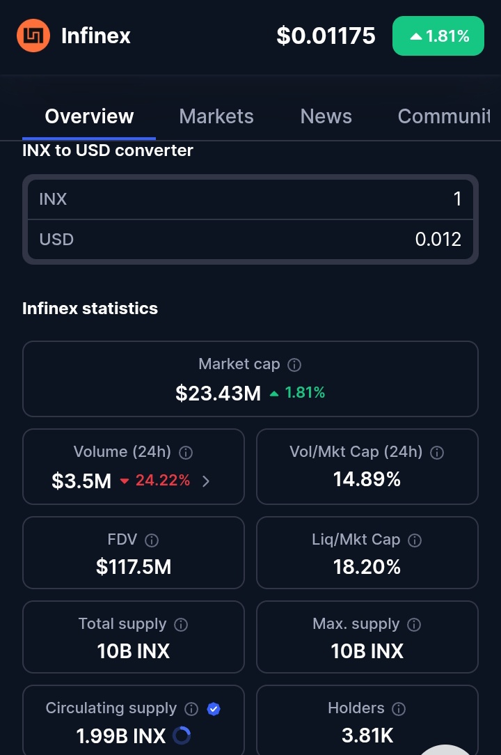 Infinex (INX) is a cryptocurrency launched in 2026and operates on the Ethereum platform. Infinex has a current supply of 10,000,000,000 with 1,994,300,000 in circulation. The last known price of Infinex is 0.01220465 USD and is up 9.19 over the last 24 hours. It is currently trading on 76 active market(s) with $7,809,969.53 traded over the last 24 hours. More information can be found at https://infinex.xyz/.
