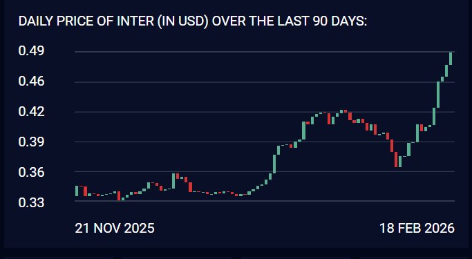 Daily price of $INTER during the past 90 days. It hit all-time low on December 1 with 0.33 USD and has risen by 50% since, currently trading at 0.49 USD. Despite the run-up, it is still only the 17th ranked football Fan Token by market cap with 5.4 million USD. https://t.co/OhKClNrXhx