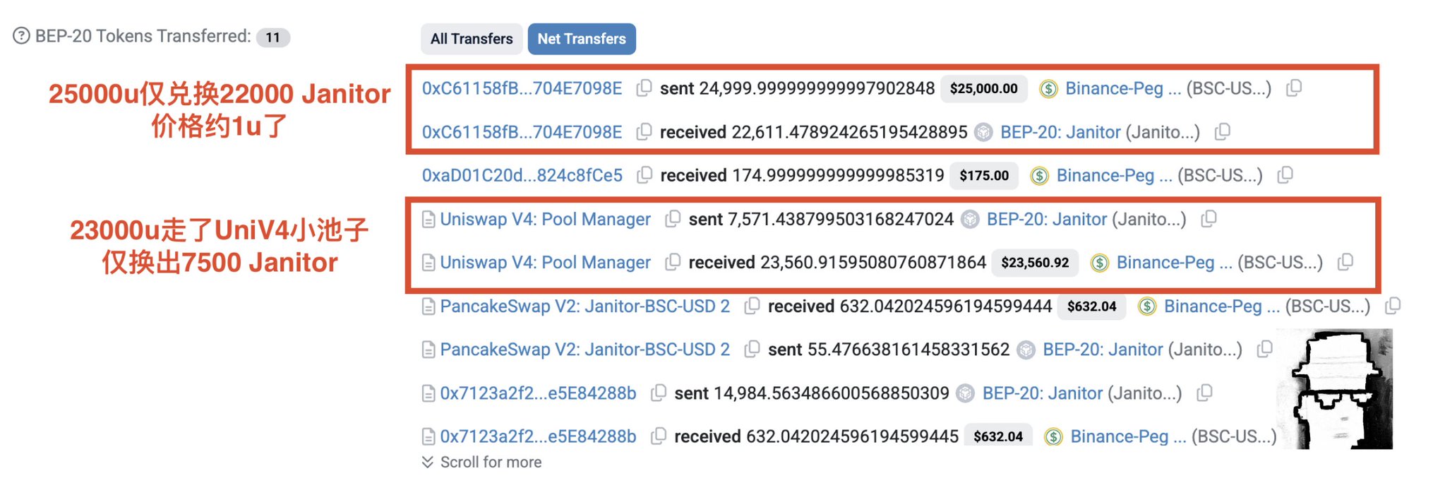 Most of Janitor's liquidity is on Pancake V3, but the swap route went through a small, illiquid pool on Uniswap V4, resulting in 25000u only exchanging for 22,611 Janitor tokens at a high price of $1.1, while the market price was only $0.01, leading to a loss of $24728.