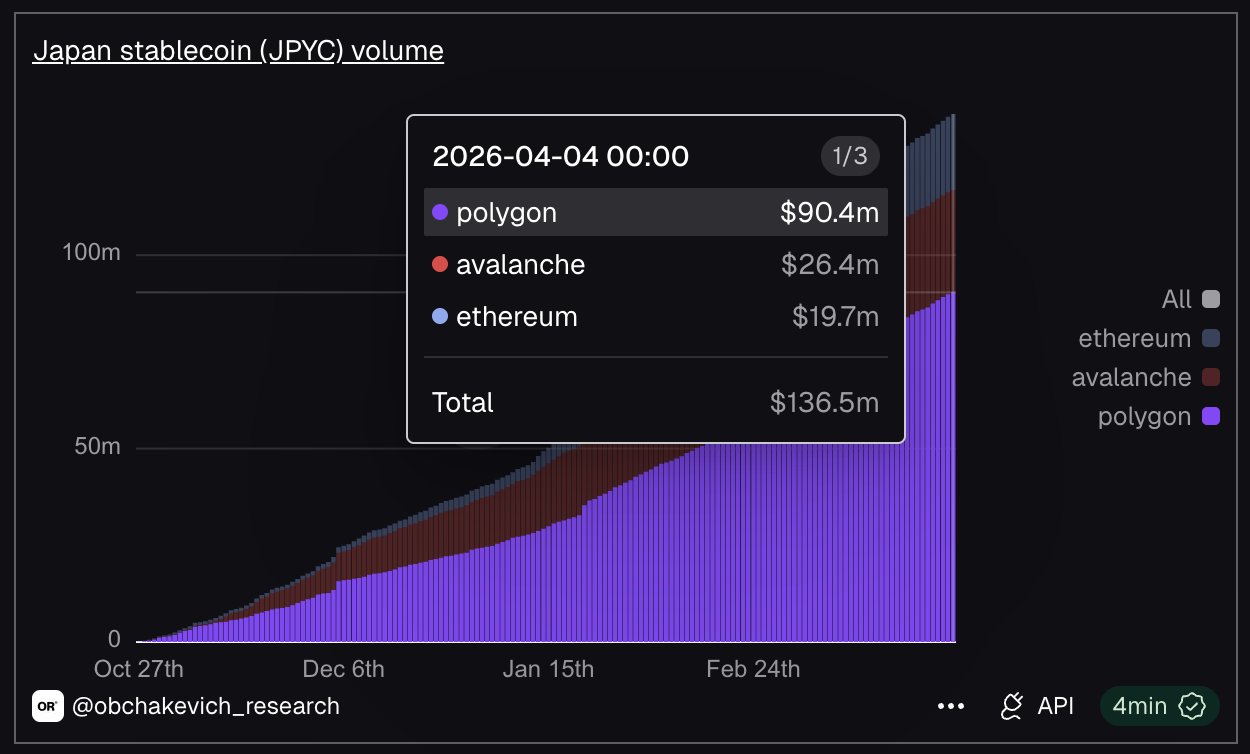 The total volume of the Japanese stablecoin JPYC has reached $136M, of which $90M has been processed on @0xPolygon.