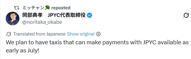 If progress goes well, a taxi service that can pay with JPYC is expected to be available in July! https://t.co/bJfmLFc0GC