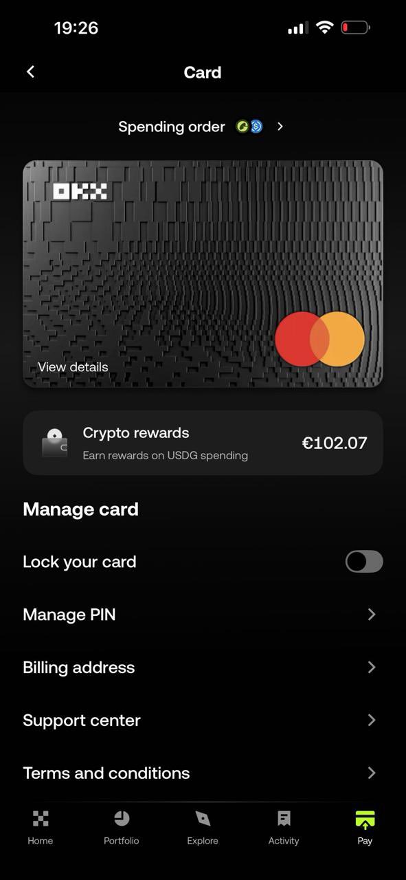 The author is satisfied with the easy cashback of the OKX card reward program, earning USDG without extra effort.