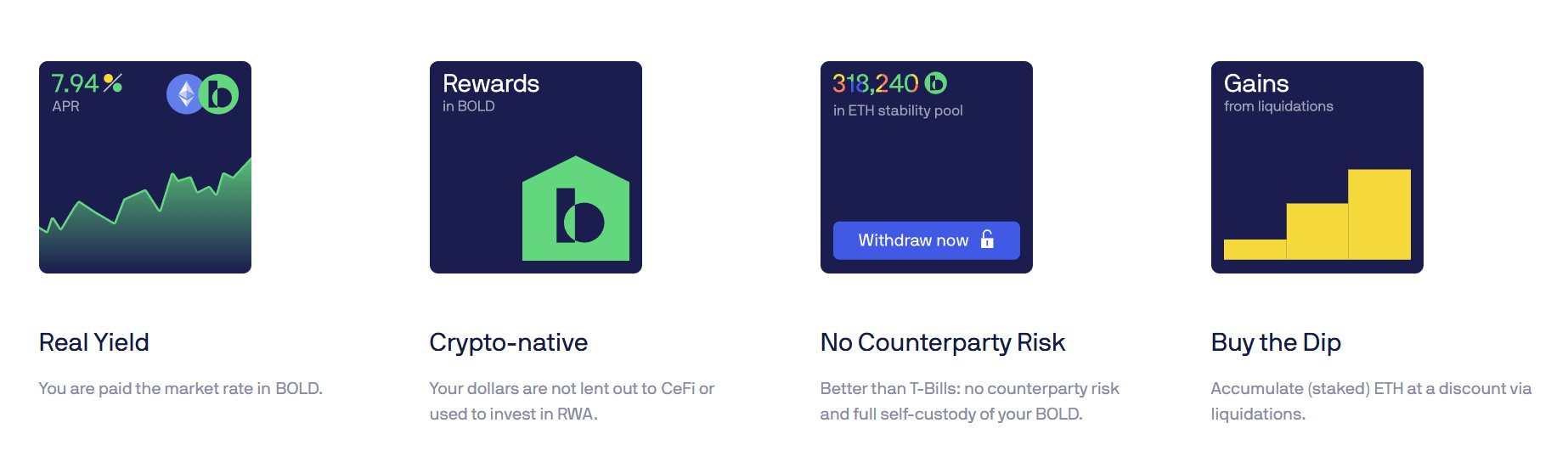 BOLD, as an on-chain stablecoin, provides counterparty‑risk‑free and transparent yield, surpassing traditional stablecoins.