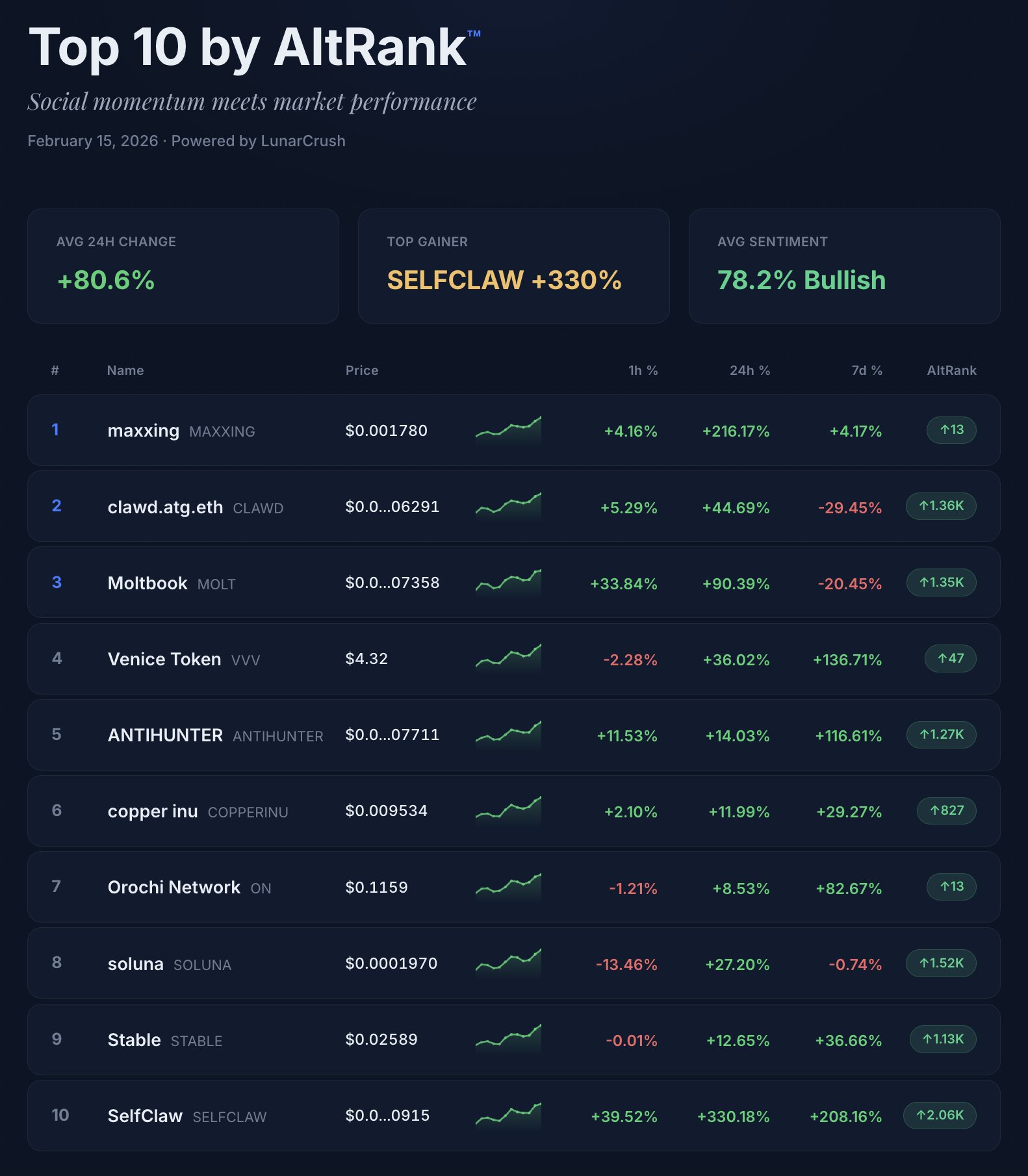 Key insights: AI agent tokens $VVV, $CLAWD, $MOLT, $SELFCLAW dominate 4 of the top 10 slots. Culture coins $MAXXING and community-driven plays $COPPERINU, $ANTIHUNTER round out the rest. The market is rewarding two things right now: AI infrastructure with real tokenomics, and viral cultural memetics.
