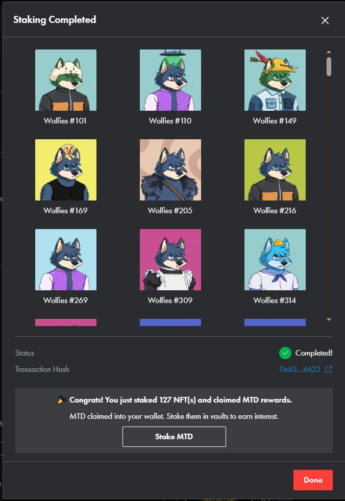 The tweet shows the user successfully staked 127 Wolfies NFTs, received MTD rewards, and is considering daily updates on staking.