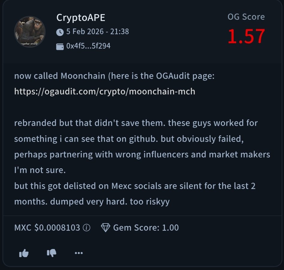🗣️ Our Social Auditors flag Moonchain ($MCH) as high-risk territory.