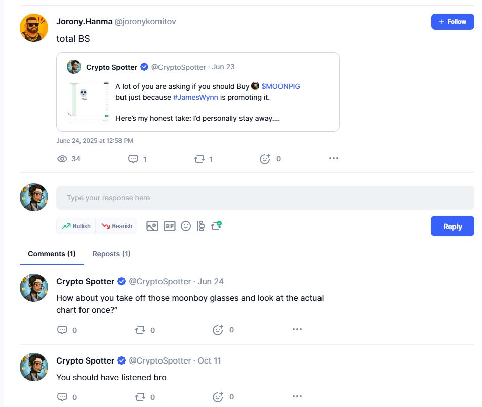 Shared an analysis on #MOONPIG warning it was a pump and dump and advised everyone to exit with profits but they called it “bullshit.”