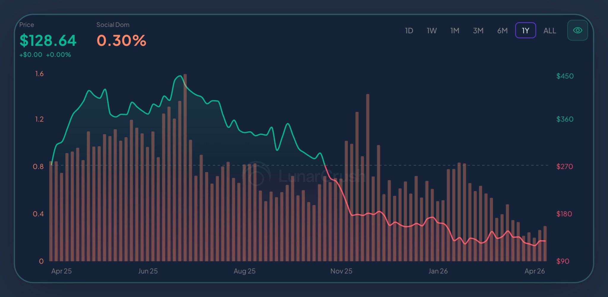 LunarCrush predicts MSTR's stock price will drop to $128.64 by April 2026, despite an increase in Bitcoin holdings.